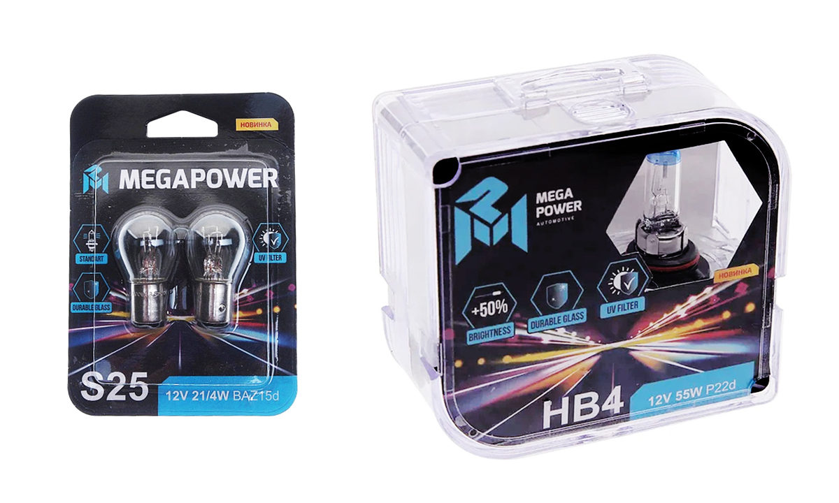 Разработать дизайн линейки упаковок для автомобильных ламп Megapower в соответствии с брендбуком. Концепция трех видов: блистера, пластиковой, и картонной упаковки. Продумать графические элементы, пиктограммы для отображения характеристик ламп.